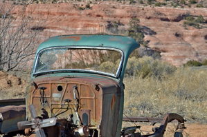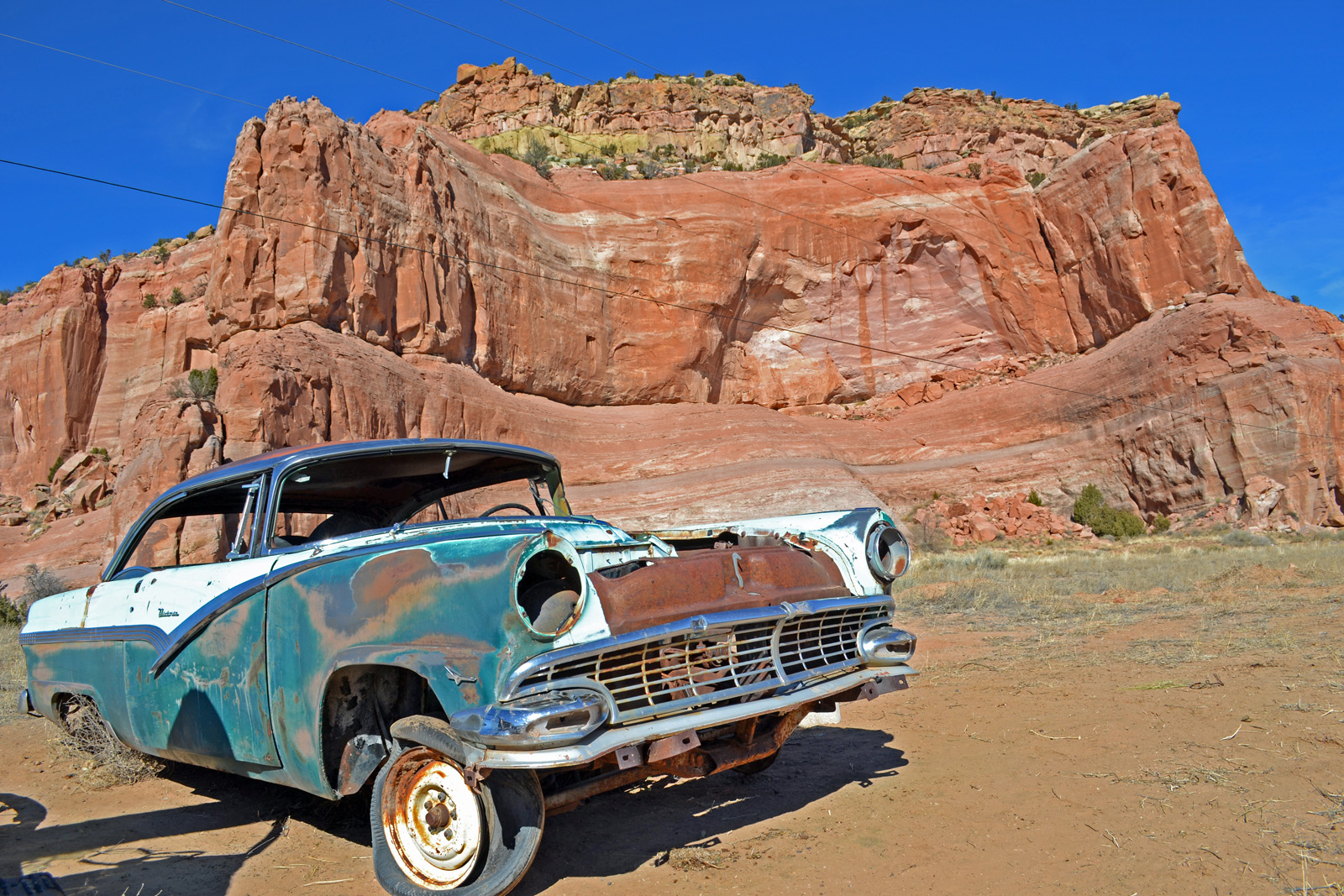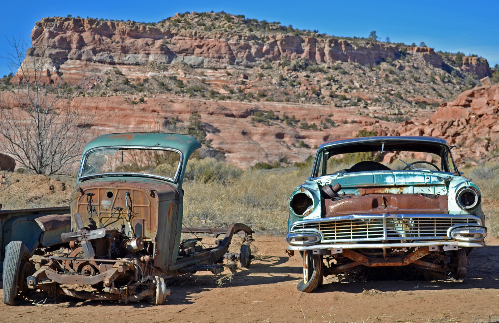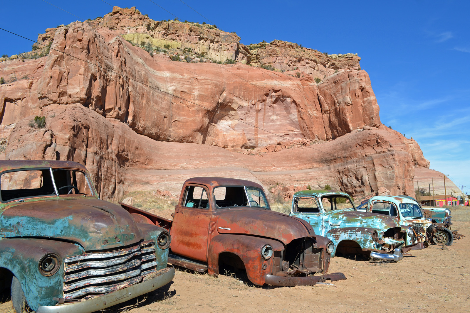 Near the state line of New Mexico and Arizona, these cars are rusting away.