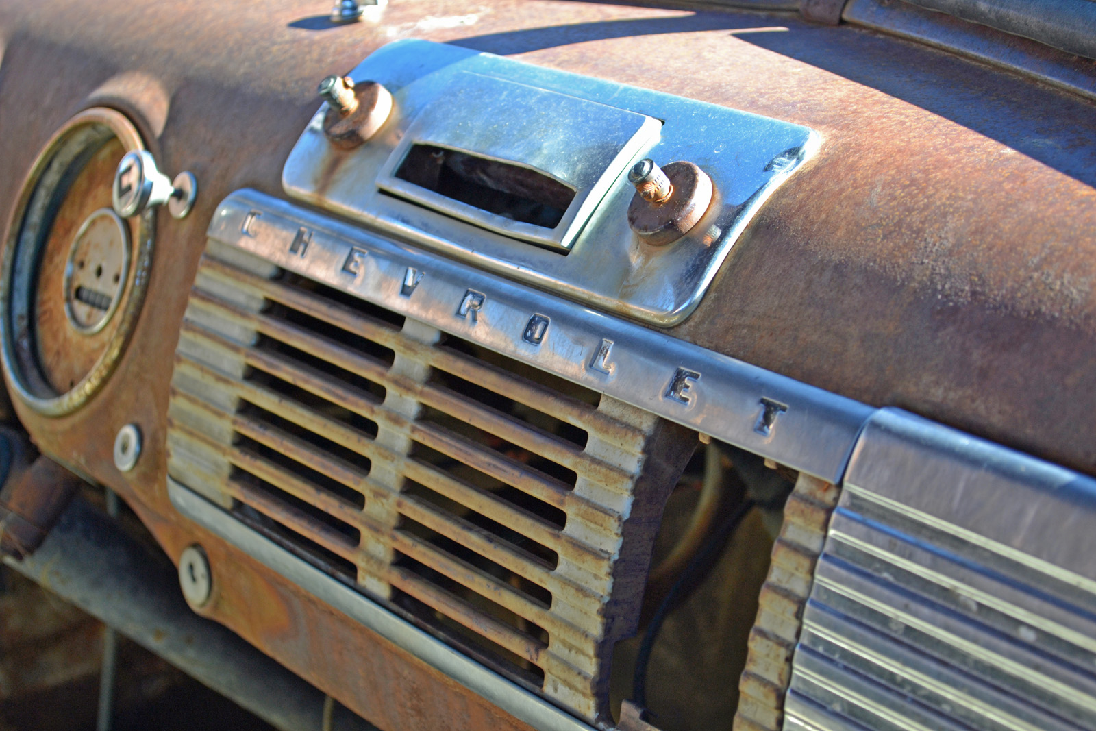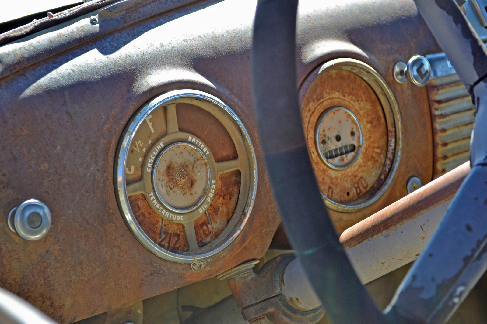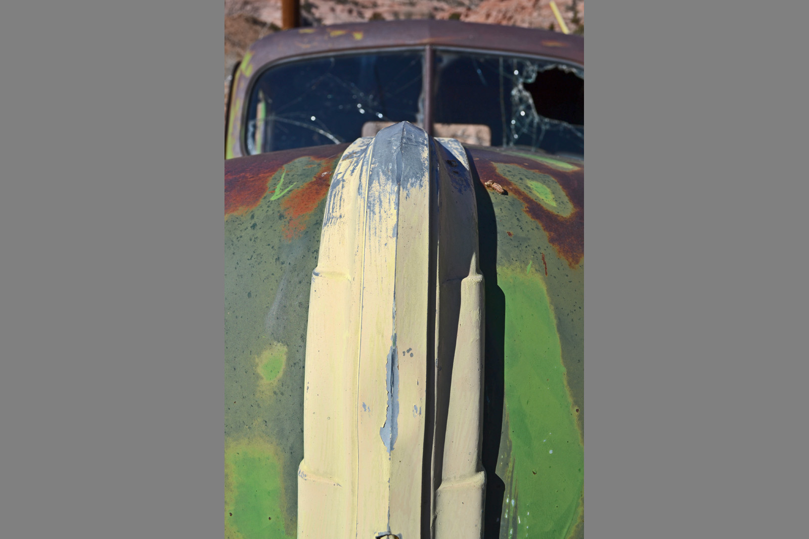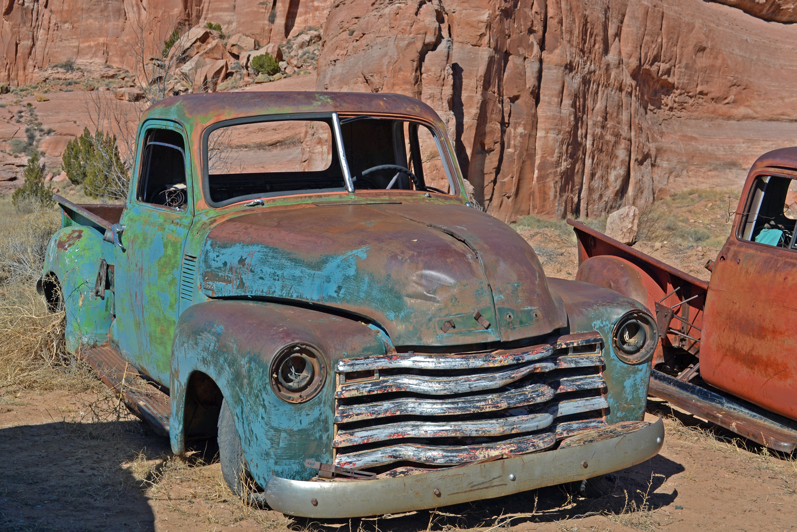 Near the state line of New Mexico and Arizona, these cars are rusting away.